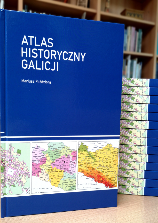 Atlas historyczny Galicji / Mariusz Paździora ; mapy: Mariusz Paździora. - Wydanie pierwsze. - Chrzanów : Miejska Biblioteka Publiczna w Chrzanowie, copyright 2021. - 1 atlas (127, [1] strona) : ilustracje, mapy wielokolorowe ; 30 cm.