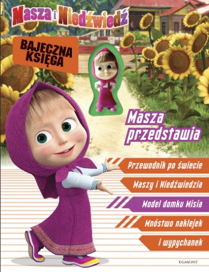 Masza przedstawia : przewodnik po świecie Maszy i Niedźwiedzia : bajeczna księga / [tekst Magdalena Stojicic]. - Wydanie 1. - Warszawa : Wydawnictwo Egmont Polska, 2018. - 23, [1] strona, [4] karty tablic : ilustracje ; 29 cm + figurka Maszy, domek oraz mebelki do składania i naklejki.