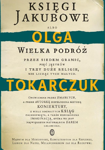 (...)Książka jest dokładnie taka jak Polska w XVIII wieku – multikulturowa, ciekawa, intrygująca. Księgi Jakubowe to nie tylko powieść historyczna. Autorka zmusza czytelnika do refleksji nad przeszłością, dziejami narodów. Zadaje pytanie o dzisiejszą kondycję Europy. Książka wieloznaczna i wielopoziomowa. /www/